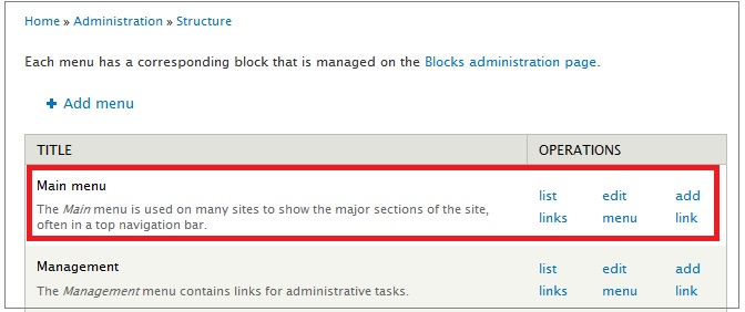Administration >> Structure >> Menu >> Main menu